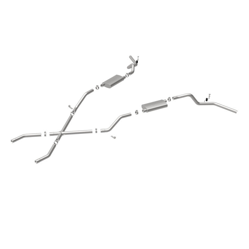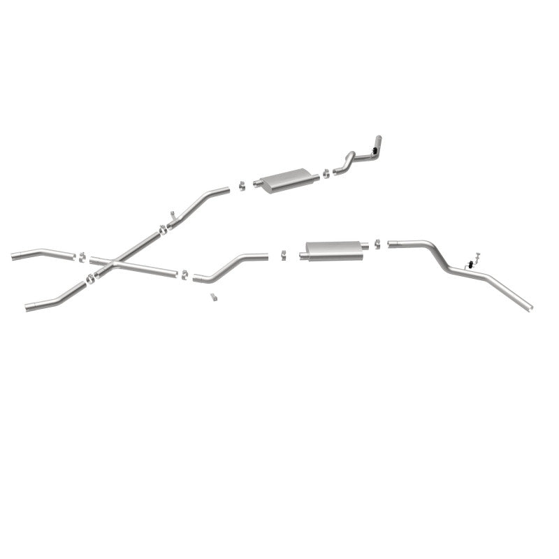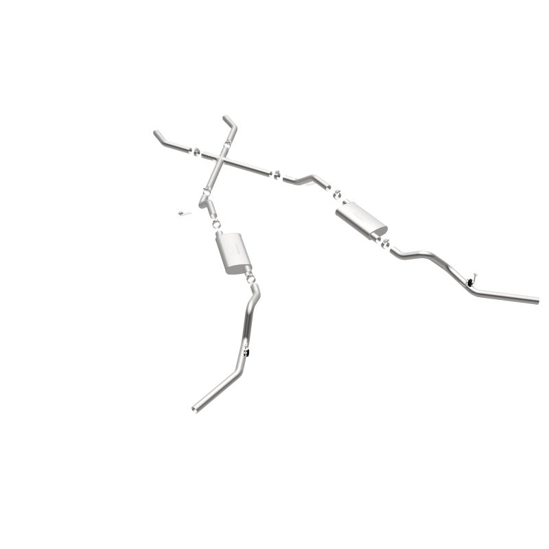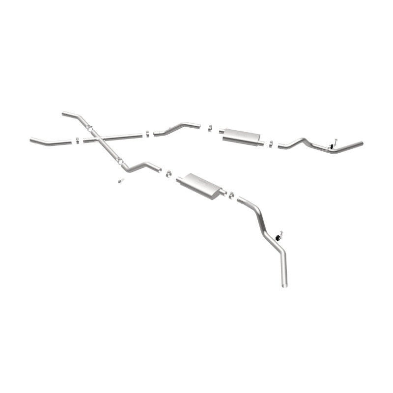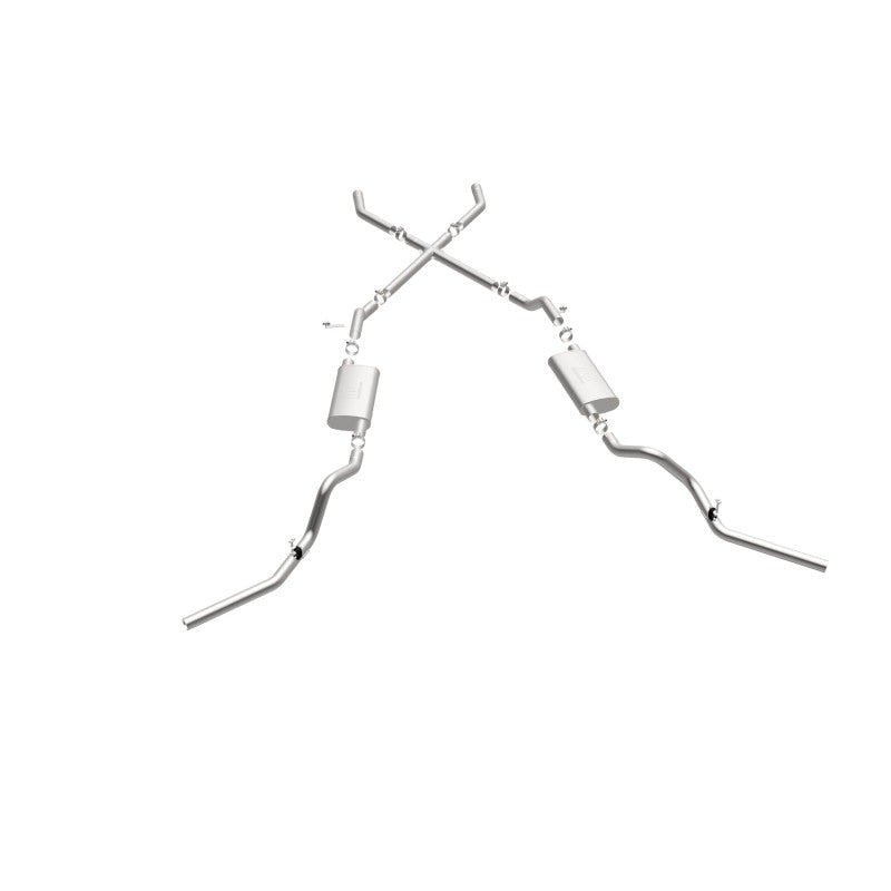 The MagnaFlow Street Series Crossmember-Back Performance Exhaust System 16643 brings enhanced engine sound and dyno-proven performance to your 3.8L, 4.1L, 4.3L, 4.6L, 4.8L, 5.0L, 5.3L, 5.7L, 6.5L, 6.6L 1960-1972 Chevrolet with a healthy helping of our deep, resonant signature exhaust note at Aggressive exterior and Moderate interior sound levels. Thanks to its durable, corrosion resistant stainless steel design, this Chevrolet exhaust system will handle whatever tarmac you decide to leave your mark on. This performance exhaust kit features a crossmember-back layout designed to replace your Chevrolet's exhaust system from the crossmember on back. With its fast-flowing, mandrel bent 2.5in. main piping and 2 Straight-Through mufflers ending in a Dual Split Rear Behind Rear Tires exit that you can enhance with tips of your choosing, your muscle car will be sounding as awesome as it looks. Extensive 3D scanning during development has resulted in a direct-fit design that you can easily install yourself. 16643 is produced using CNC precision robotic manufacturing techniques and is backed by MagnaFlow's limited lifetime construction warranty.