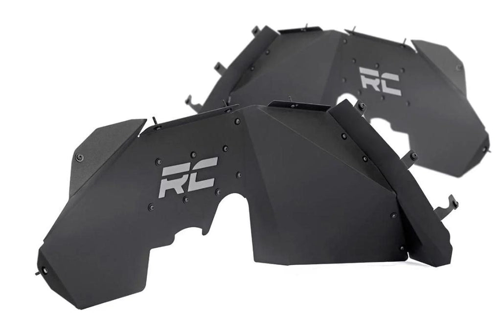 Complete the look of your Jeep Wrangler JK with the Rough Country Front Inner Fender Liners. These black powder-coated steel inner fender flares provide protection and a clean appearance. The front inner fender liners include paintable plates that fit behind the cutout “RD” logos. Rough Country designed their inner fender liners for use with their Tubular Fender Flares and Fender Delete kits, but they are also compatible with most aftermarket fender flares.