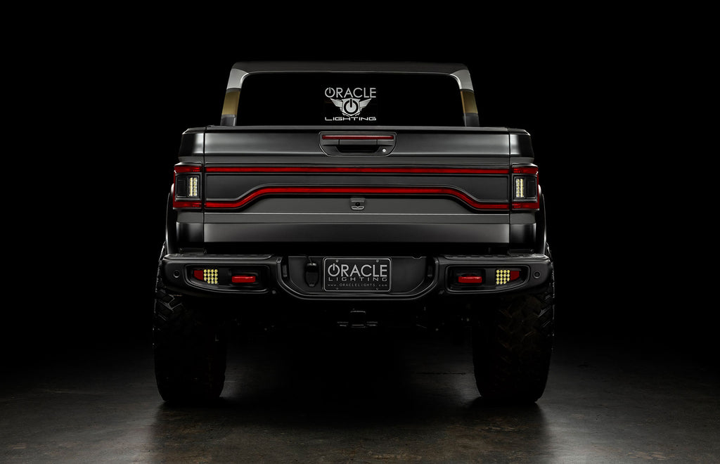 Inspired by the Mopar "Racetrack" Tail Light Design found on the Dodge Charger and Dodge Durango this innovative product from ORACLE Lighting adds a LED panel which links the flush tail lights into a fluid illuminated design while still honoring the Mopar styling DNA. This is designed to work with the ORACLE Flush LED Tail Lights (Part# 5882-504) this panel picks up where the tail lights stop carrying this design across the tailgate for a big visual impact. Jeep Gladiator Flush Tail Lights are SOLD SEPARATELY. Installation is easy with mounting handled by a pre-installed VHB adhesive backing and wiring consisting of a simple Plug-&-Play connector for the 4 Pin trailer slot. No tools are required for installation and no modifications are needed. Functionally this design adds multiple PNP features to the tailgate increasing rear facing illumination and visibility. The larger running light illuminates dimly when the vehicle is driving with the headlights on and then instantly intensifies to 100% brightness when the brake is depressed. The LED Turn Signals feature an animated motion sequence for a vibrant indicator array.