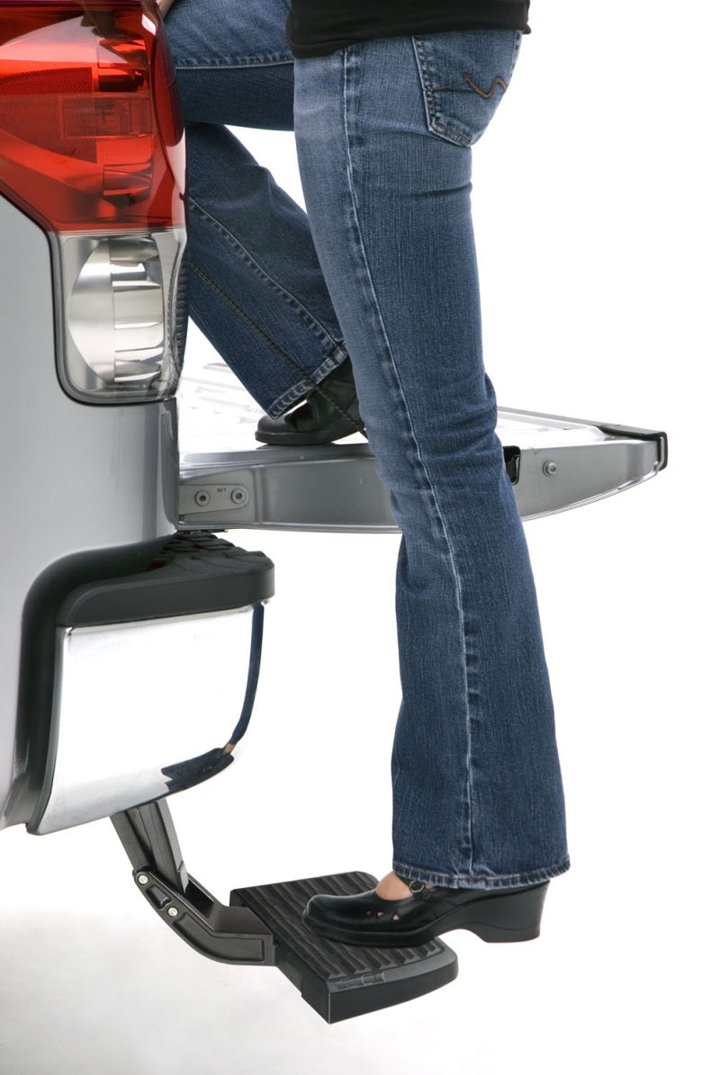 GO AHEAD AND STEP ON IT. BEDSTEP(TM) IS A REAL TIME SAVER. Not to mention knee and back saver. Strong and rugged, this non-slip, retractable bumper step quickly flips down with the nudge of a foot providing a faster, easier and safer way to load or unload your pickup's cargo. Supports up to 300 lbs. Frame-mounts, under the rear bumper so it works even with an open tailgate or when towing. BEDSTEP(TM) is made in the USA and backed by a 3 year-26,000 mile warranty. The AMP Research BedStep(TM) is designed to perform flawlessly in snow, ice, dust, mud and dirt. This lightweight, yet rock-solid bumper step assist employs a rugged die-cast aluminum alloy linkage assembly that is crafted in the USA, and black-anodized and PTFE powder-coated for maximum corrosion protection. Precision, stainless-steel hinge points and press-fit bushings ensure trouble-free action and reliable, maintenance-free operation for decades. Die-cast-aluminum alloy linkage components and precision-machined pivot points give BedStep(TM) rock-solid stability, and PTFE powder-coating ensures years of trouble-free, corrosion-proof operation. The ridged, non-slip step is molded of strong glass-reinforced resin, for safe footing even in mud, snow or ice.