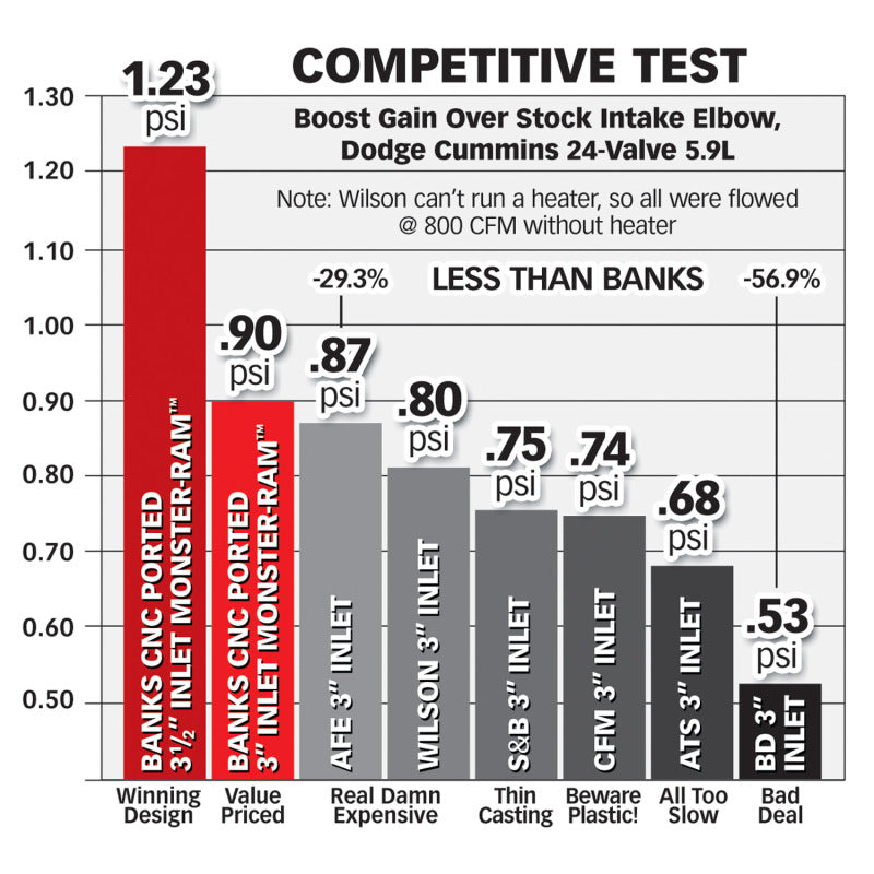 Monster-Ram improves airflow from the intercooler. Raises boost without increasing backpressure at the turbine. Result: a more responsive, fuel-efficient engine. Up to six 1/8 inch NPT ports for flexibility! At Banks Power, just enough is never enough when it comes to engine airflow. Maximum power, performance and efficiency are the ultimate goals, but to make it all happen the engine has to breathe freely and without needless restrictions. Finding ways to pump your engine full of cooler, denser air has always been the key. Our High-Ram intakes have always whipped the competition. Our new Monster-Ram flat-out destroys it. Utilizing the latest in electronic computational fluid-dynamic technology, tested on the flow bench as well as on the dyno, and finally proven in the real world where the rubber meets the road, Monster-Ram is a beast that only Banks could have unleashed. A simple, direct-replacement casting, Monster-Ram is instant power, performance and acceleration gratification. The factory inlet is cramped and angular compared to Banks' larger, streamlined cast-metal Monster-Ram. It's the perfect upgrade whether you're just starting out or working to build a serious, purpose-built machine. And with up to six ports for water/meth/propane/nitrous injection (or pressure/temp. sensors), the sky's the limit for performance expandability. Monster-Ram is CNC port-matched to the stock heater as well as the optional Banks Billet Intake Grid Heater Delete spacer. Includes 3-1/2 inch mandrel-bent boost tube. With up to six ports for water/meth/propane/nitrous injection (or pressure/temp. sensors), the sky's the limit for Monster-Ram's performance expandability.