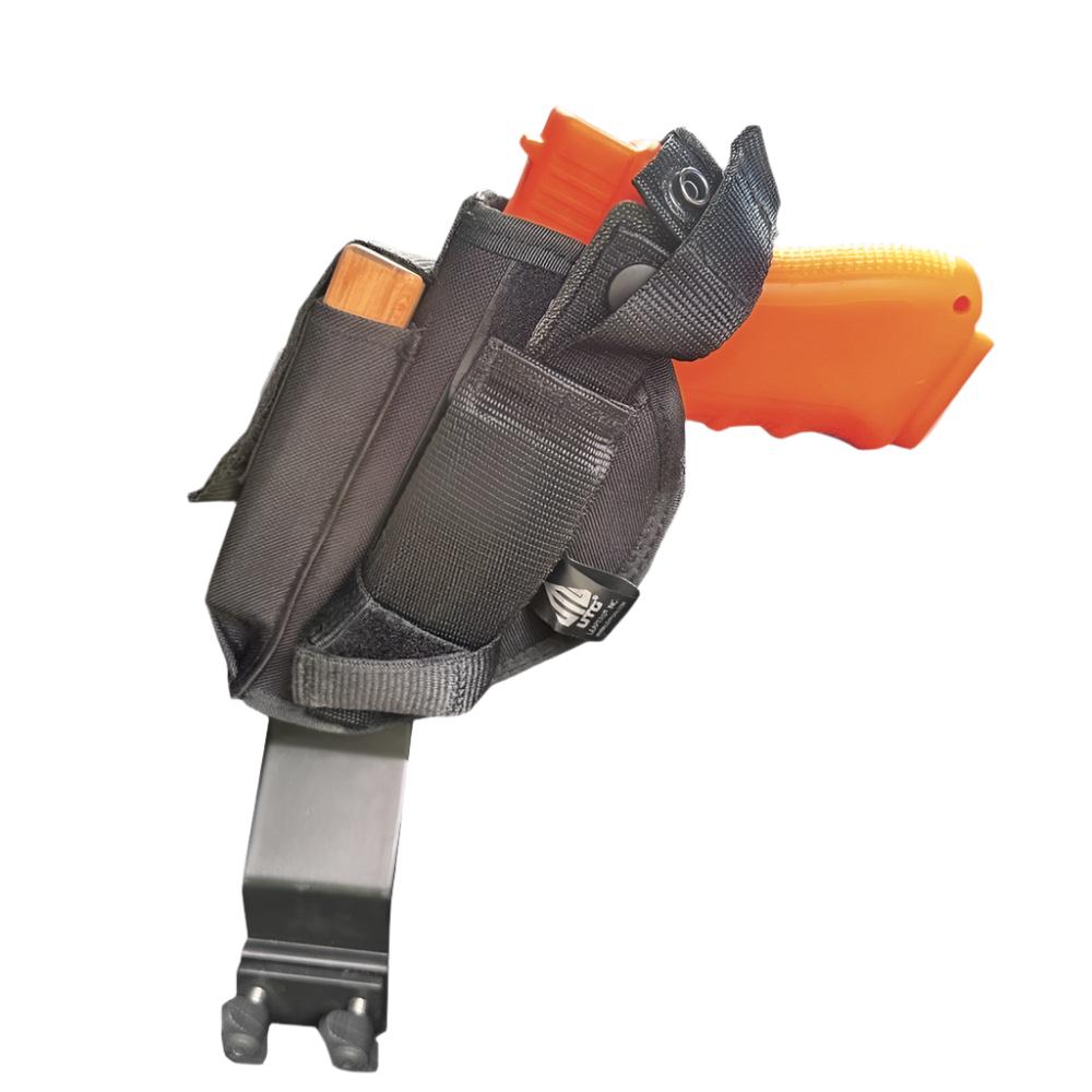 The universal holster (included in the kit) works with a variety of semi-automatic and revolver style pistols from many manufacturers, including the large frame Smith Wesson 686 four inch barrel 357 magnum, to small frames like the Smith Wesson 38 Special, and less lethal self defense options such as Byrna's.