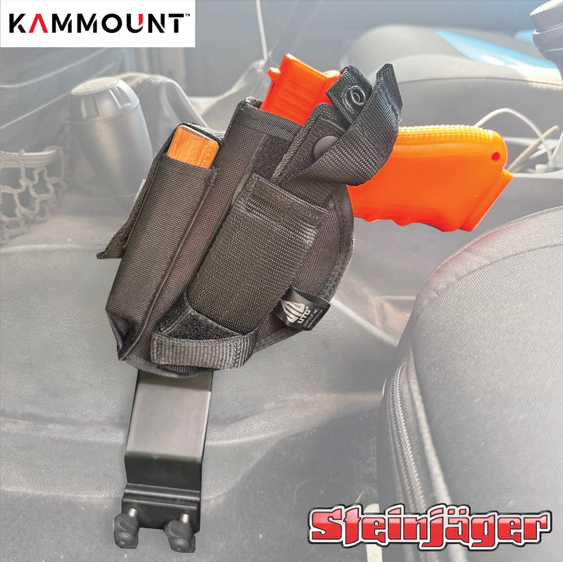 THE KAMMOUNT™ CENTER CONSOLE FIREARM KIT, DESIGNED AND MANUFACTURED IN THE USA, ATTACHES TO YOUR VEHICLE'S LOWER FLOOR CENTER CONSOLE IN LESS THAN A MINUTE WITHOUT ANY TOOLS. THIS UNIQUE PATENT PENDING DESIGN FEATURES A HEAVY-DUTY STEEL 'BASE' UNIT THAT IS MADE TO ACCEPT OTHER CUSTOMIZED ACCESSORIES AND A GROWING LIST OF KAMMOUNT™ ACCESSORIES.